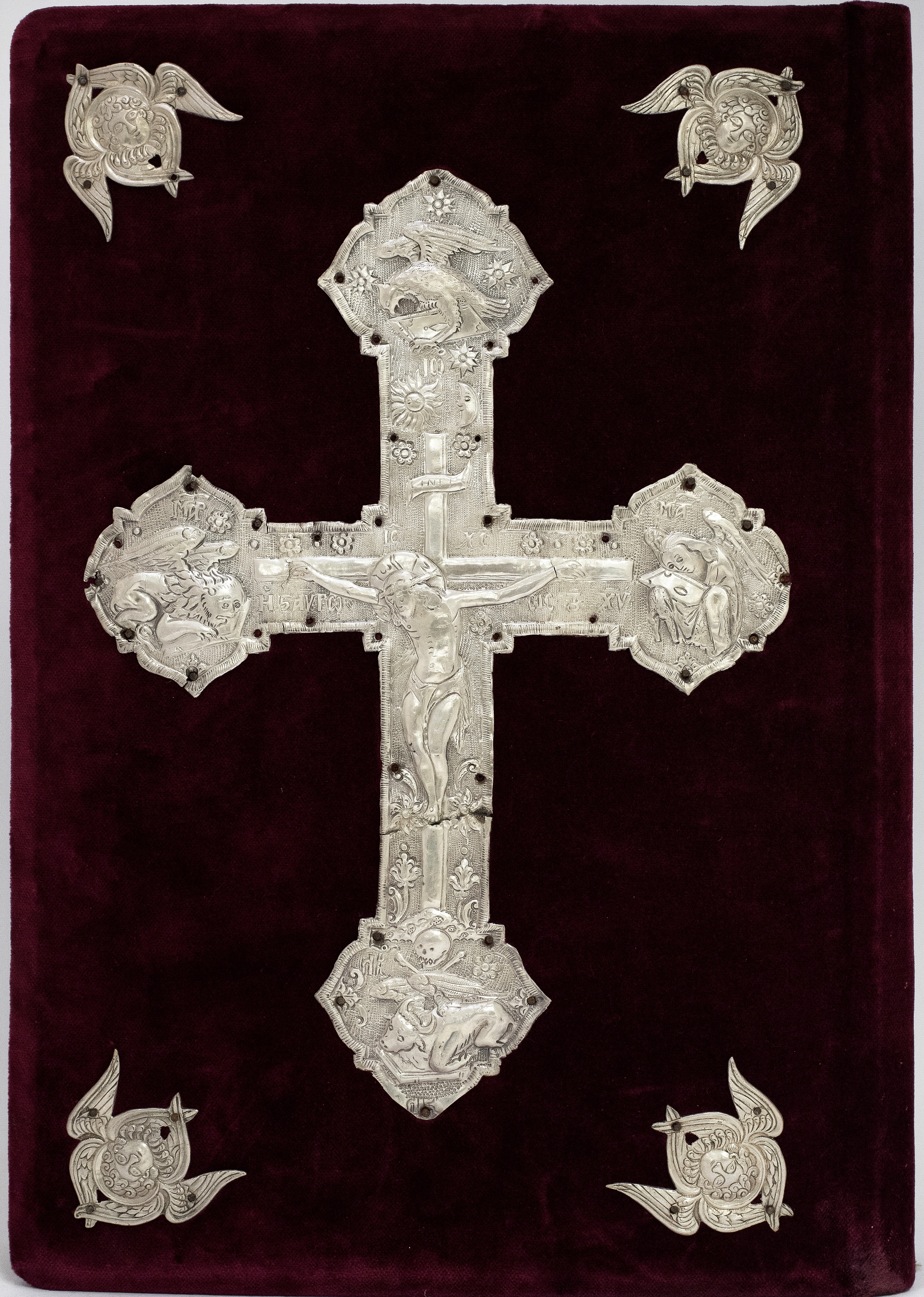 Задњи оков Јеванђеља садржи представу крста са Распећем Христовим док су у тролисним крацима представљене симболичке персонификације Јевнђелиста. Крст са задњег окова Јеванђеља пазарске цркве сличан је литијским крстовима са југа Балкана и Атоса, којима су узор литијски крстови од сребра са млетачког Медитерана из XV и XVI века. Централна сцена Силаска у Ад на предњем окову делимично је упрошћена у односу на описе традиционалних ерминија, а као иконографска особеност јављају се одвојене групе представљених мушкараца и жена приказаних иза праоца Адама и прамајке Еве. Картуш истог иконографског садржаја налази се и на сребрним рипидама Старе пиротске цркве из 1842. године.